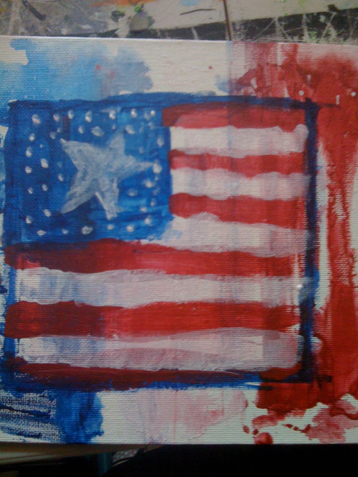 We painted stripes of red white and blue on foil and stamped our canvas.